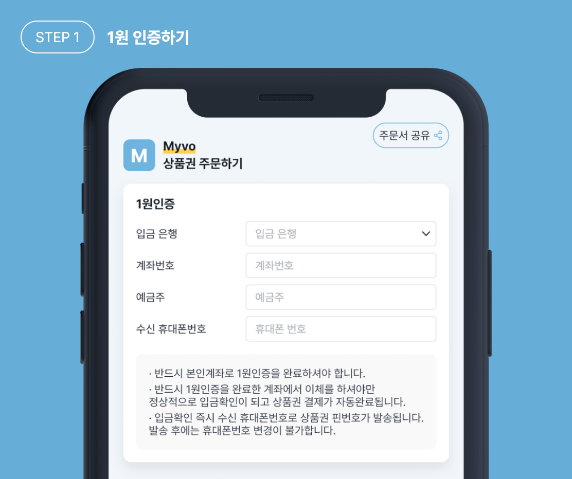 1원 인증을 진행할 입금 은행을 선택한 뒤, 계좌번호, 예금주명, 상품권을 수신할 휴대폰번호를 차례대로 입력합니다.